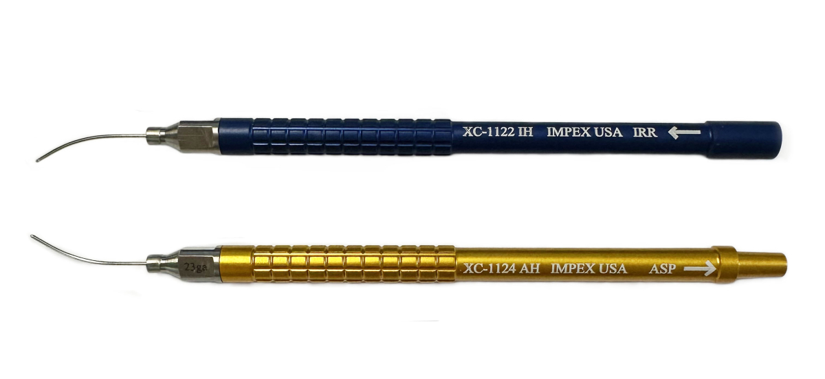Irrigation/Aspiration Bimanual Handpieces solid, 23 GA curved, .3mm aspirating port. Overall length 4.75"