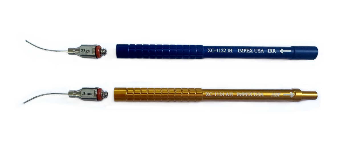 Irrigation/Aspiration Bimanual Handpieces exchangeable tips, 23 GA curved, .3mm aspirating port. Overall length 4.75"