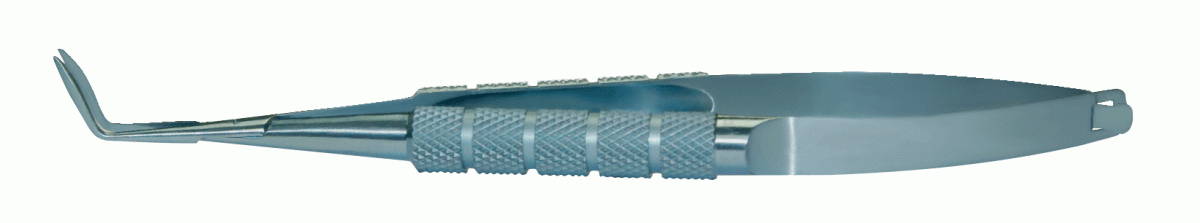 IOL Folding and Implanting Forceps, angled, internally polished jaws Round 8 mm dia cross action handle w/out lock Overall length 125 mm, 4.9"