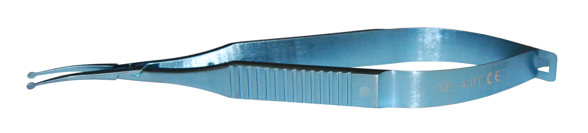 Curved 18mm shafts with 1.5mm x 1.6mm grasping platforms. Flat cross action handle 9mm wide. Overall length 120mm, 4.7"