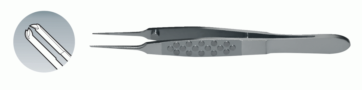 Castroviejo Corneal Tying Forceps Straight, 0.12 mm, 1 x 2 teeth 6.0 mm tying platforms Flat 7 mm wide handle Overall length 100 mm, 3.5 inches TC teeth and platforms