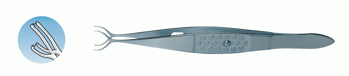 Two Points Fixation, U-shaped separated by 8 mm, Each tip 0.12mm, 1 x 2. Flat 10mm handle with thumb lock. Overall length 105mm, 4.1". TC teeth