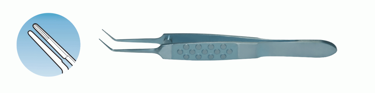 Bishop-Harmon Iris Forceps, 4mm delicate serrated tips, Flat 6 mm wide handle, Overall length 75 mm, 2.9 inches
