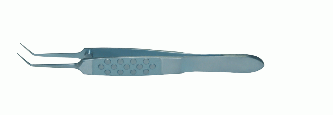 Bonn Iris Forceps Angled, 4.0mm tying platform, flat 6mm wide handle, overall length 72mm, 2.8 inches