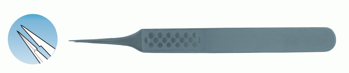 Straight narrowed shaft with fine pointed tips, 6 mm tying platforms, Flat 9 mm wide handle, Overall length 110 mm, 4.3". TC platforms