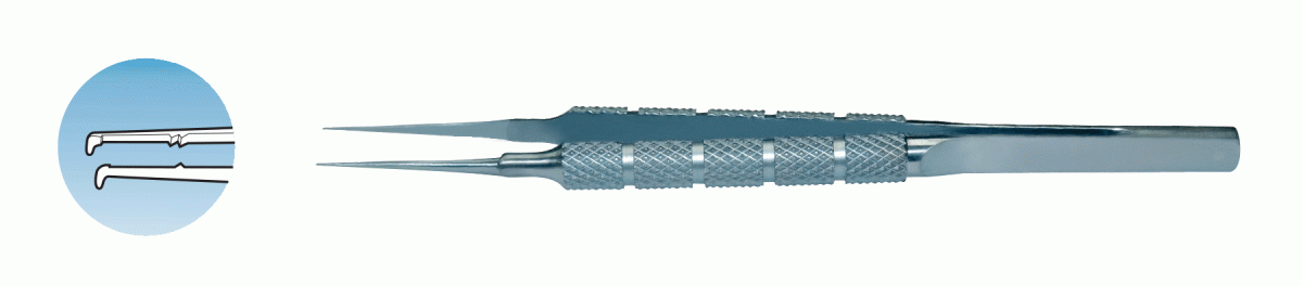 Grasping tips to lift trabeculatomy flap. Delicate 12 mm shafts. Round 8 mm dia handle. Overall length 108 mm, 4.2 inches