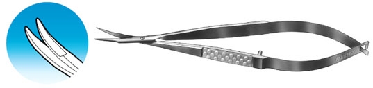 XS-601 Castroviejo Corneal Scissors Curved Blunt. 12 mm blades from mid screw to tip. Flat 6 mm wide handle Mat finish Overall length 106 mm, 4.2 inches