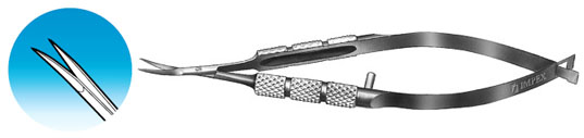 Vannas Scissors. Curved Sharp 9mm blades, Round 6mm dia handle. Overall length 84 mm, 3.3 inches.