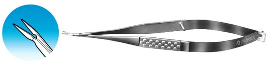 Vannas Scissors Angled Long. Sharp 8 mm Blades. Flat handle 7 mm wide. Overall length 118mm. 4.6 inches