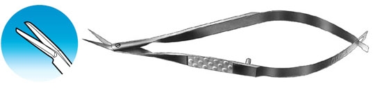 Vannas Scissors Angled to Side. Sharp straigtht 10 mm blades. Flat 6 mm handle. Overall length 90 mm, 3.5 inches.