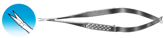 Vannas Scissors Straight Extra Long. Sharp 7 mm blades. Flat 7 mm handle. Overall length 118 mm, 4.6 inches.