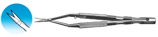 Impex Vannas Type Scissors Straight. Sharp 6 mm straight blades. Round 2 hinge handle. Overall length 106 mm, 4.2 ".