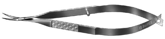 Iris scissors curved, sharp curved 11 mm blades from mid screw to tip. Flat 7 mm dia handle. Overall length 100 mm, 3.9 inches.