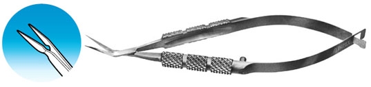 Impex Anterior Capsulatomy Scissors. Angled 10mm blades Sharp blades. Round handle. Overall length 82 mm, 3.2 inches.