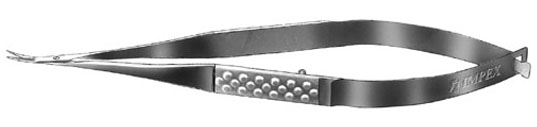 Vannas scissors curved. Sharp 7 mm Blades, Flat Handle 7 mm wide. Overall Length 118mm, 4.6 inches.